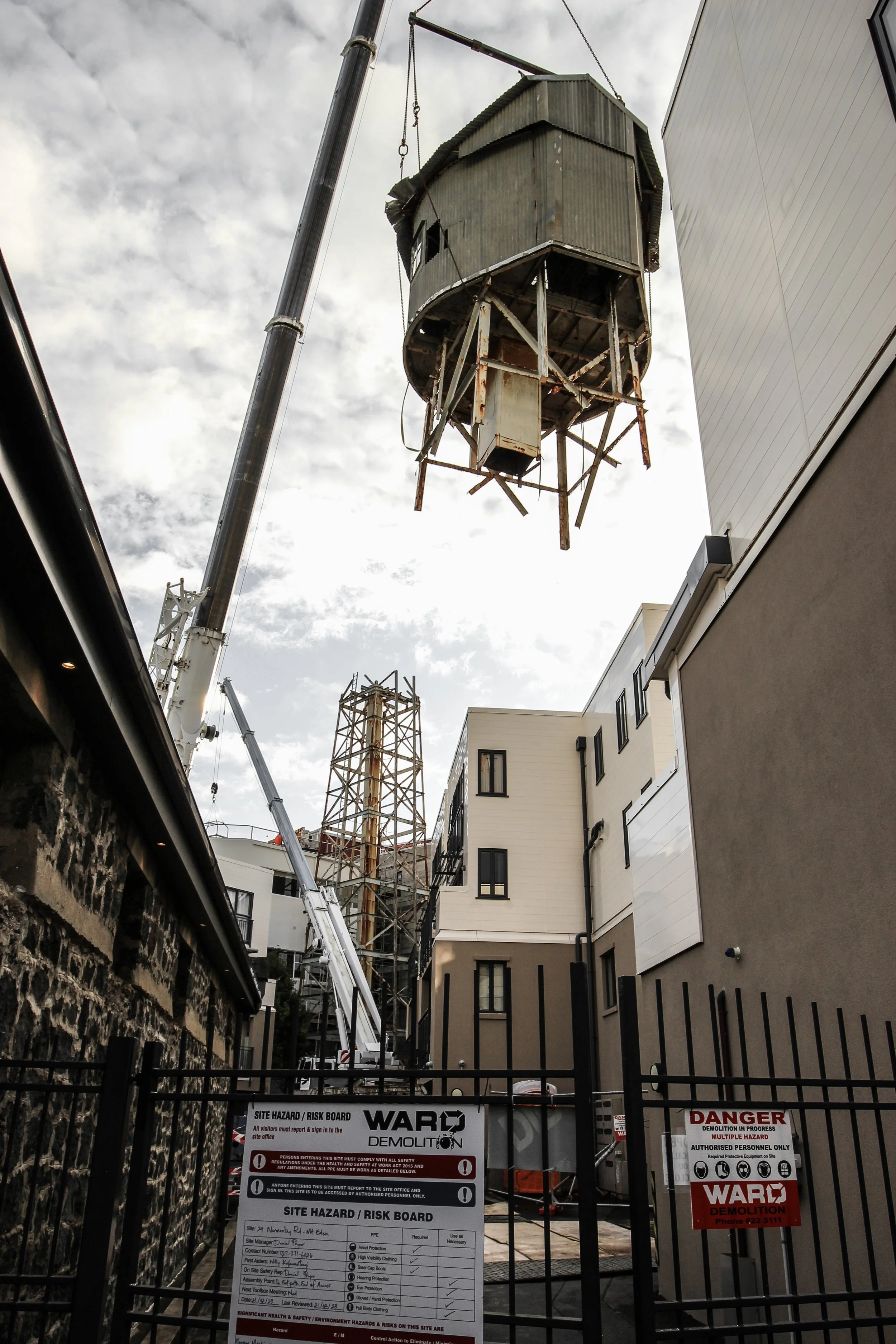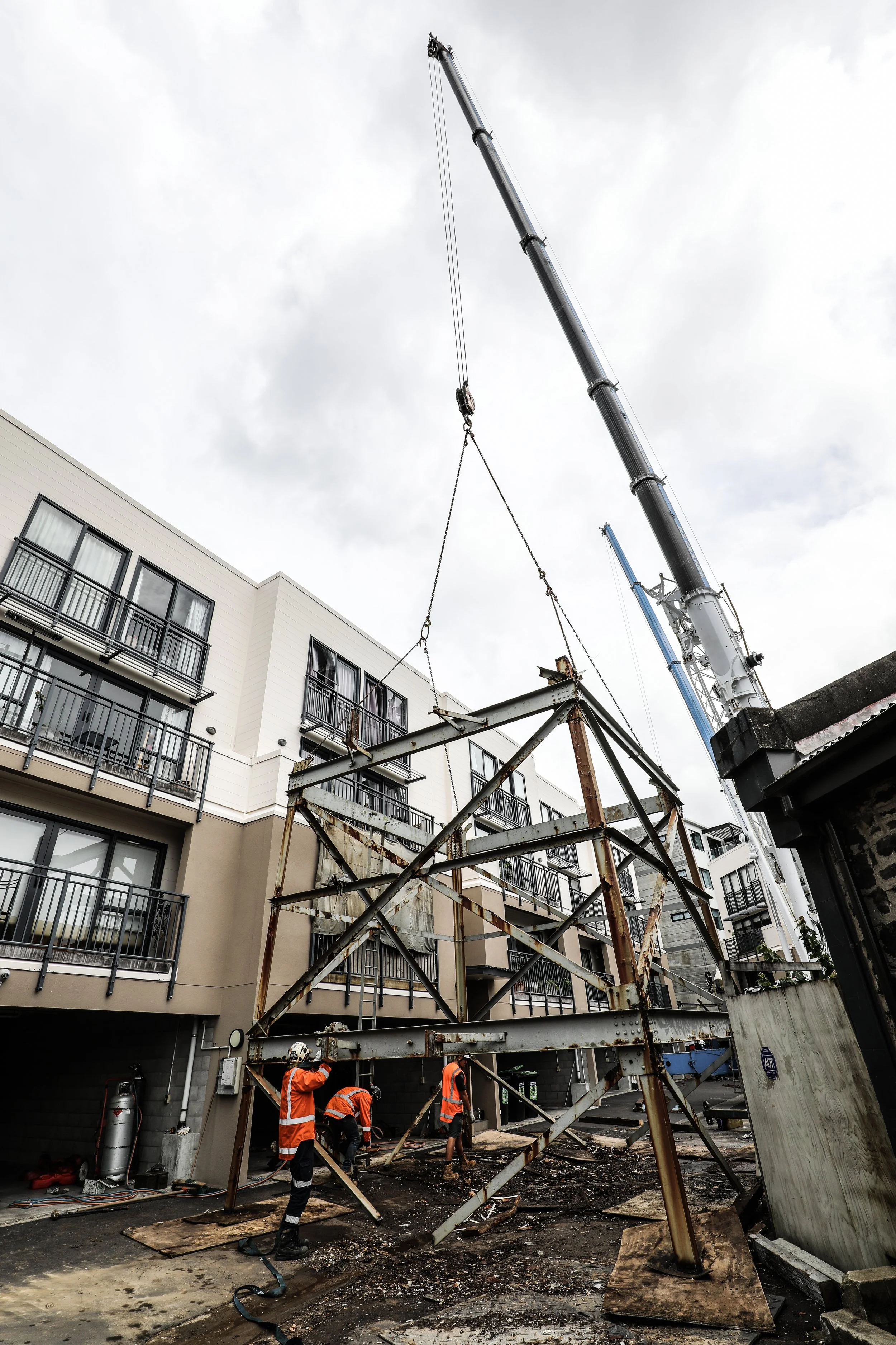 Once stripped out, the top piece weighed about 12 tonnes and had to be lifted over the neighbouring appartments before we could lower it into a space for dismantling. We gently removed the weathervane which was given to Auckland Museum. The only surviving piece of the category 1 heritage structure.