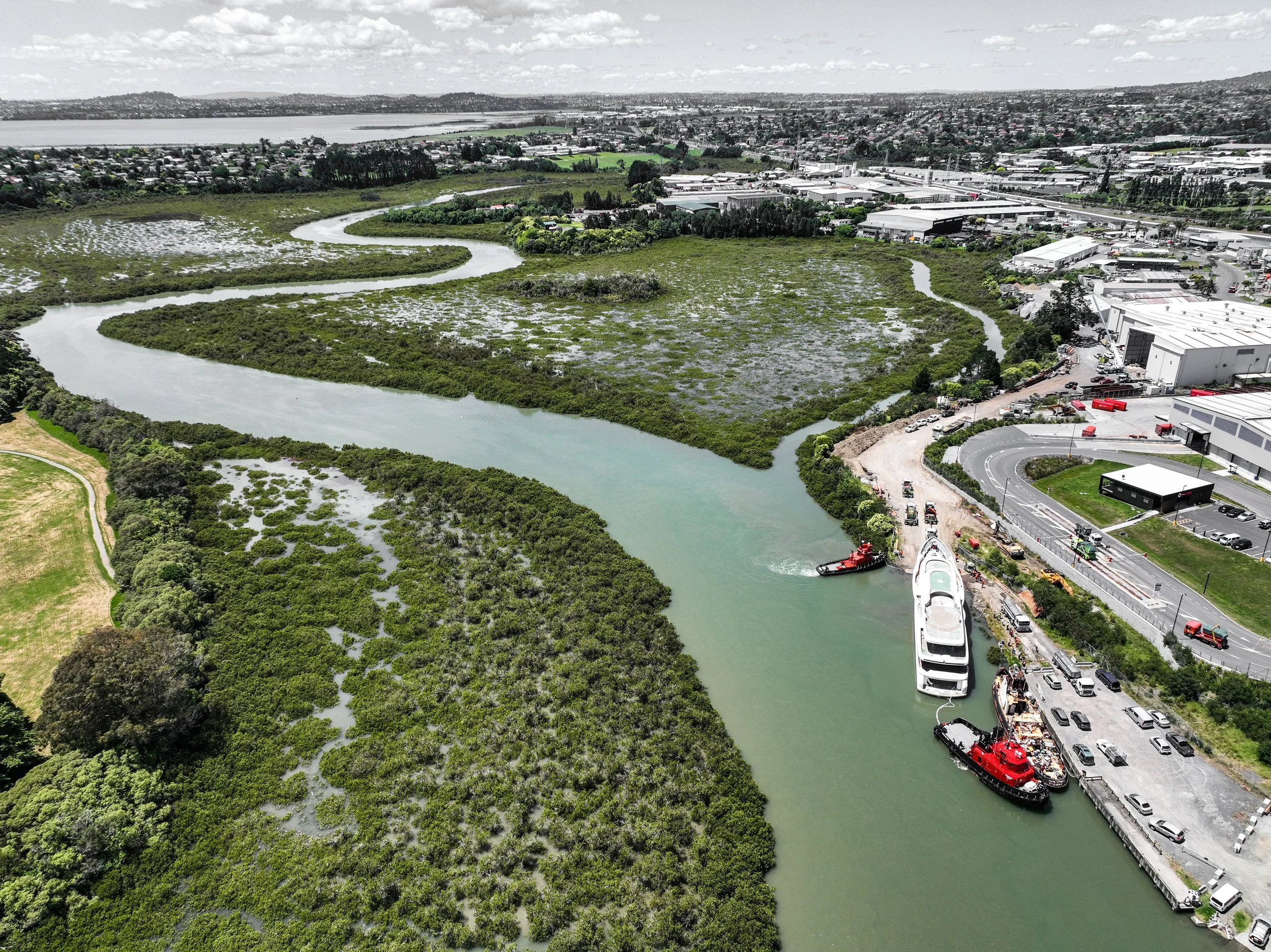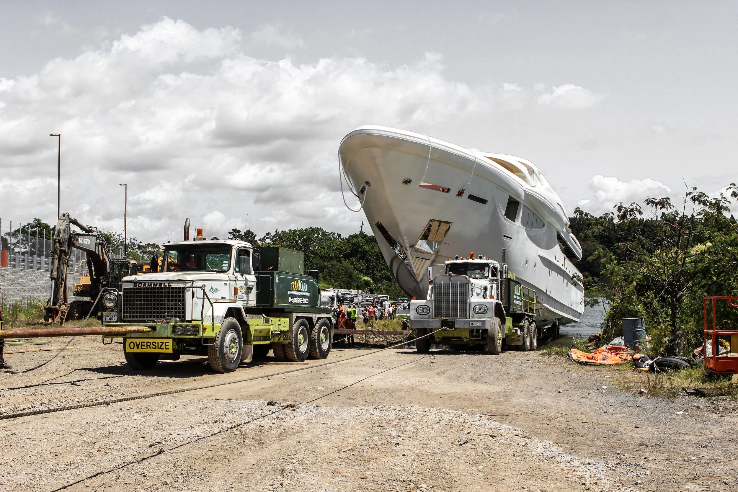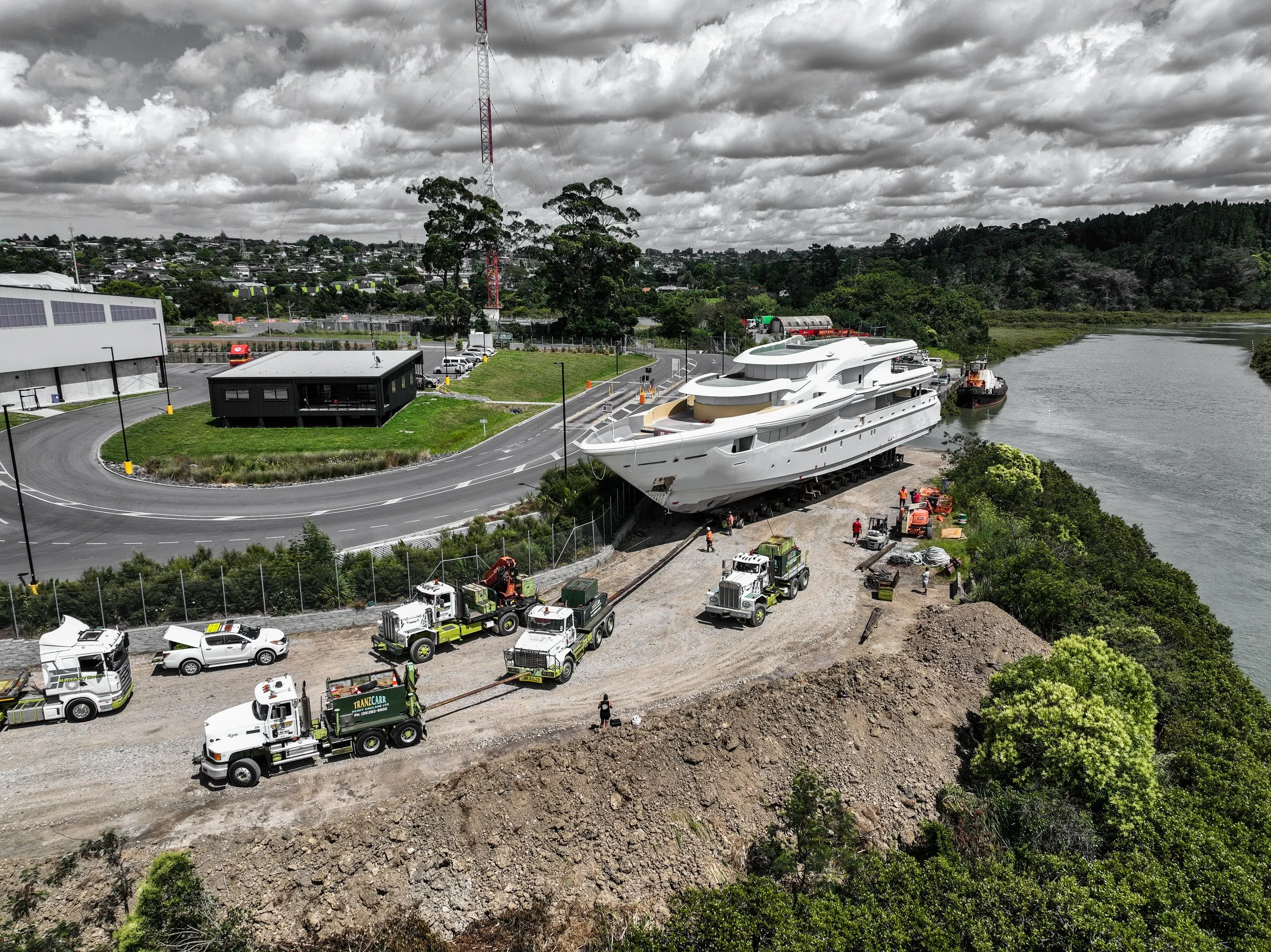In 2022, just before Christmas, Ward had the pleasure of assisting in the launching of SY32 into the Auckland Harbour. Tyler Ward, who was part of the original 2017 Demolition team, spent multiple days meticulously preparing the ramp. On December 28th 2022 we were honored to witness the launch of the Super yacht. Tranzcarr Heavy Haulage did an incredible job using four trucks and a custom-built trailer, they successfully rolled the Super yacht out of the shed and launched it into Henderson Creek, where it was barged down to the Auckland Harbour. From there is was loaded onto the Yacht Express, before making its Voyage across the Tasman sea. A remarkable end to its life here in New Zealand but merely the start of its journey.