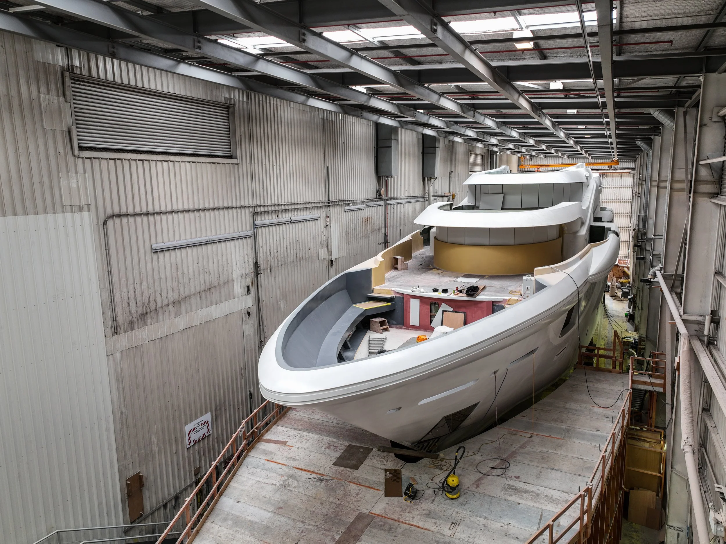 It’s not every day you come across a half built super yacht on the salvage list of a demolition site. In 2017 that’s exactly what happened. The West Auckland based company “Sensation Yachts” fell into receivership 8 years prior to our 2017 introduction to the project. 3 half built Super Yachts were left abandoned ever since. Two of the Yachts weren’t as far along in their build and reluctantly had to be demolished. The clear jewel amongst the ruin, SY32 was too incredible to let go to waste. Ward took a sizable risk and paid for its relocation and storage into the neighbouring shed, so the sites demolition could commence.