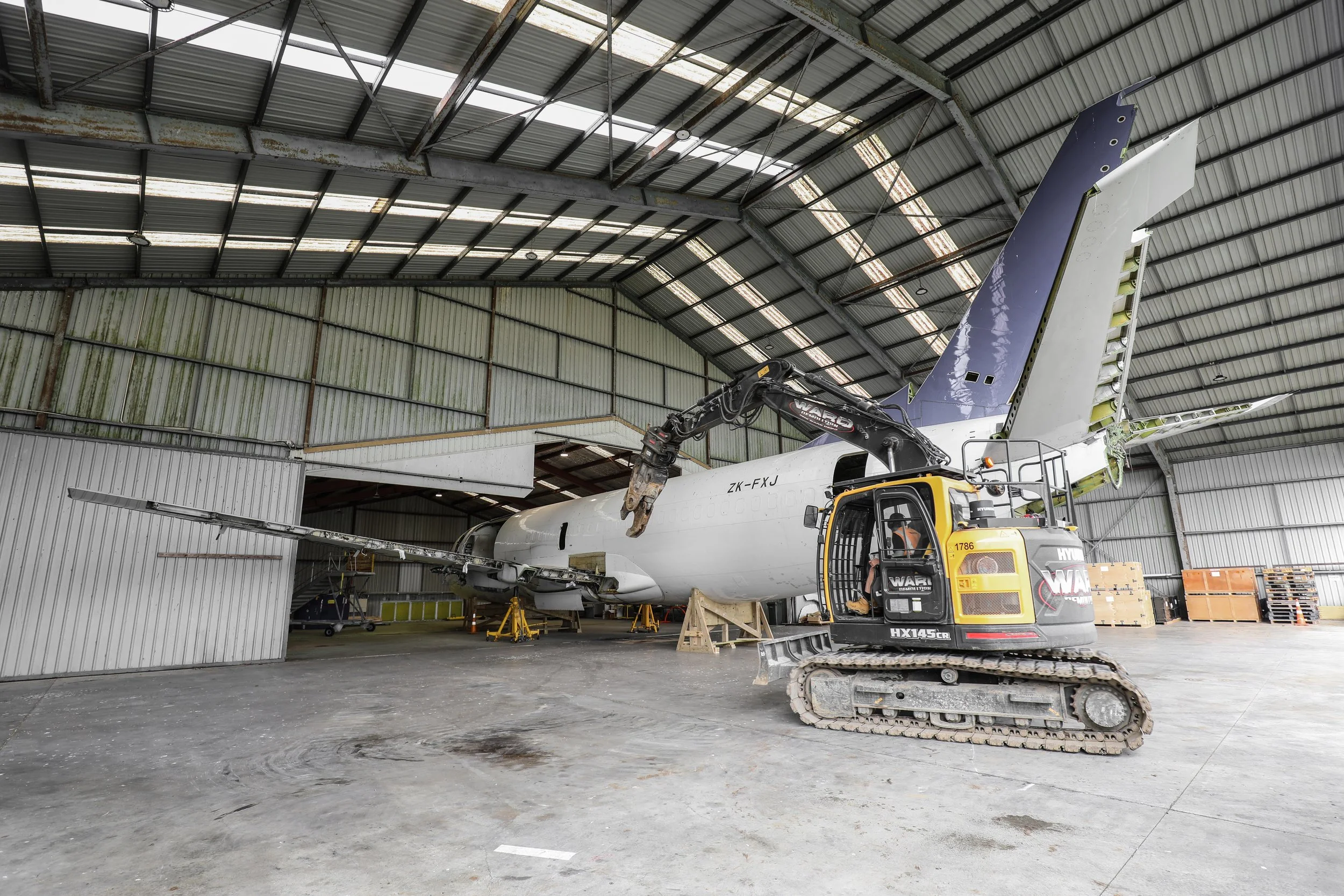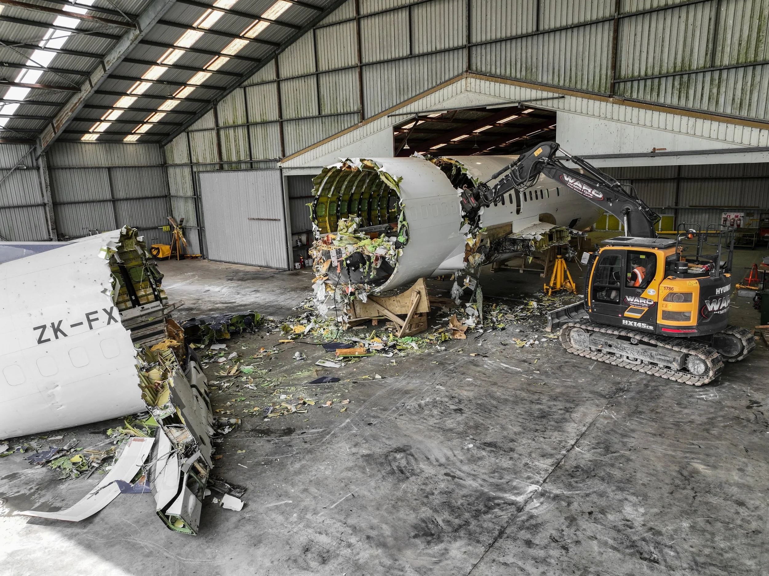 Ward Demolition have demolished multiple planes in its time. The pictured aircraft is ZK-FXJ Aircraft Boeing 737-36E was manufactured in 1991 in Seattle, commissioned by Viva Air, Spain. Starting out as a passenger plane it was then converted to freighter configuration in 2004. It was involved in an inflight emergency involving a fire in the cargo hold forcing an emergency landing in 2019. After many flights and owners, it’s final flight was in July 2024, ending its life in Hamilton airport where the team scrapped it for parts, leaving its bare hull for Ward Demolition. Our team chopped it up, recycling the scrap and leaving the cockpit intact to transport to a local’s playground.